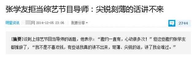 对此张学友多次曾几次回应媒体的追问,首先他表示确实有接到很多综艺邀约,酬劳也比较合理,但是都被他推掉了,因为“有些话我真的讲不出来,苛薄、尖锐的话,讲了我会难过。”而在另一次受访时,他则表示,自己没有资格做人家的导师,如果做了很容易误人子弟。