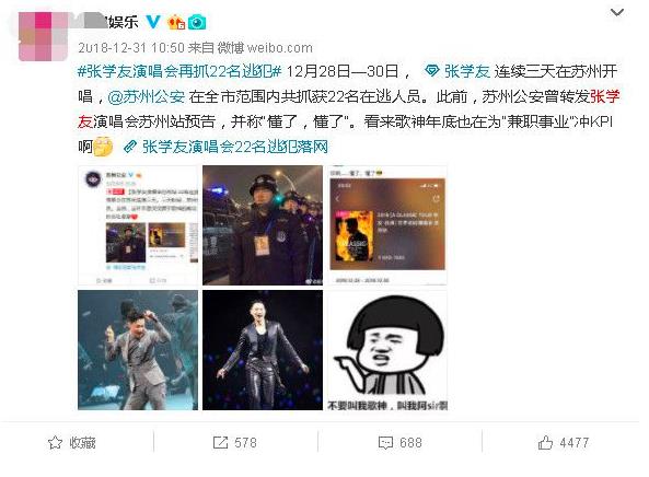 张学友一直专注于音乐,专注于个人巡回演唱会,他的演唱会,除了能奉上华语乐坛最高水准的音乐,更成了”逃犯克星“,迄今为止,已有46名逃犯在他的演唱会上落网。