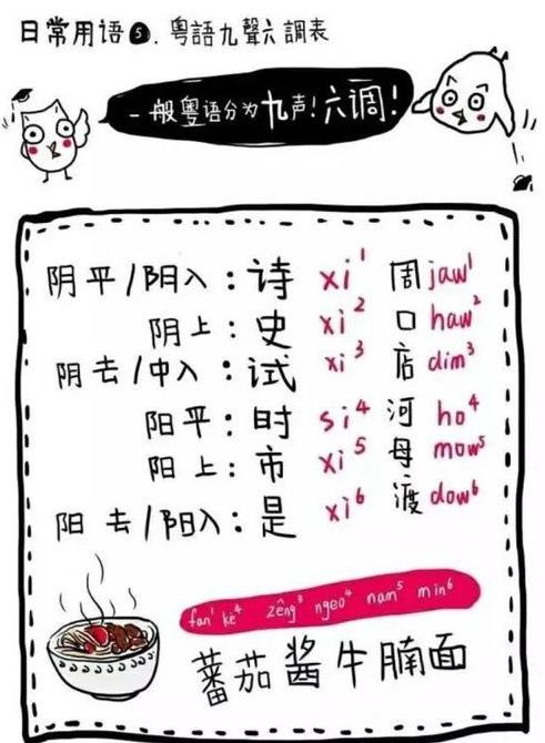 而为了方便母语非粤语的外地人学习,粤语语言学家常用一句深入浅出的俗语“番茄酱,牛腩面,逼客食”来依次代表9声的不同音值调性: