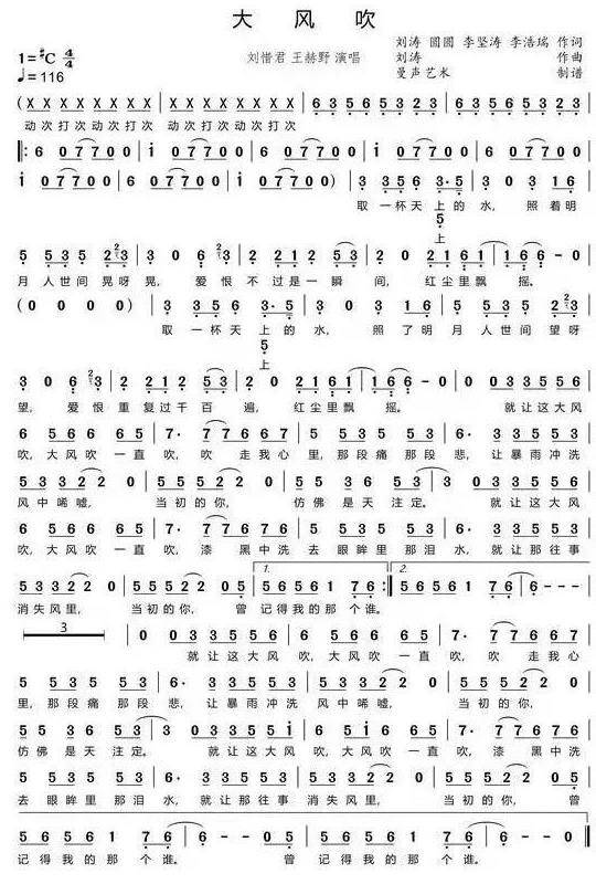 ▲《大风吹》曲谱-王赫野、刘惜君合唱版