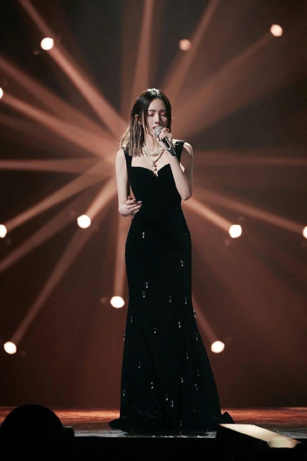 她独自站在舞台中央,一身黑色长裙把身材凸显的凹凸有致,表情清冷,演绎王靖雯的《执迷不悔》。