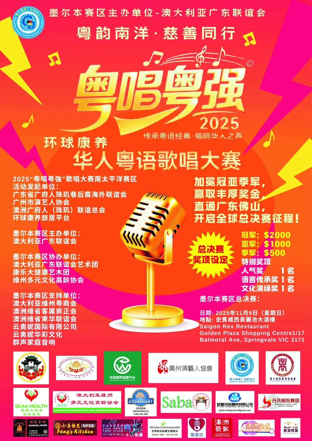 2025“粤唱粤强”华人粤语歌唱大赛以“弘扬粤语文化、推动慈善公益、发现歌唱人才”为主题,自启动以来受到广大粤语歌唱爱好者的热烈关注。本次大赛旨在推动粤语及粤语歌曲在澳洲华人社区中的传播与传承,为当地粤语歌唱爱好者提供展示才华的舞台,并以粤语歌曲为纽带,搭建起连接澳洲华人的“乡音彩虹桥”。赛事不限参赛者国籍、年龄及职业,只要热爱粤语歌曲均可报名参与。